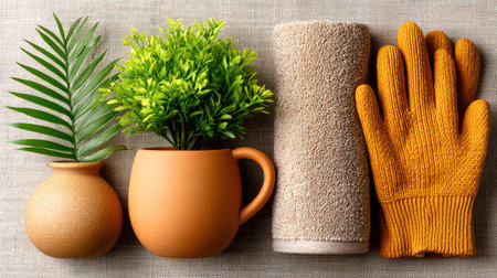 A close-up display of colorful gardening gloves and a trowel rests beside vibrant flower pots, showcasing the beauty of nature and gardening tools in an outdoor setting.
