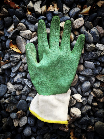 One clean blank green work glove on a gray concrete background. Protection of hands from mechanical damage