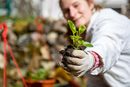 Caucasian woman replanting flowers in pots while working outside in the garden using gloves and special soil