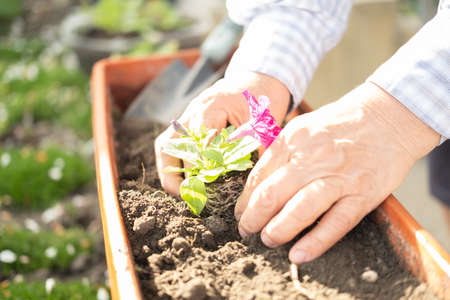 Gardener planting with flower pots tools. Woman hand planting flowers petunia in the summer garden at home, outdoor. The concept of gardening and flowers.