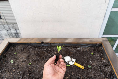 Planting young seedlings of lettuce in vegetable raised bed