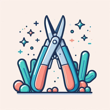 Gardening scissors Top view photo with copy space Yellow pruner on bright two-tone background Minimal style