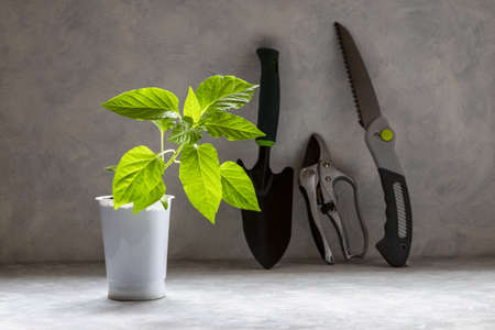 Young bell pepper seedlings in a plastic cup and gardening tools. Ecological domestic cultivation of pepper in winter and early spring.