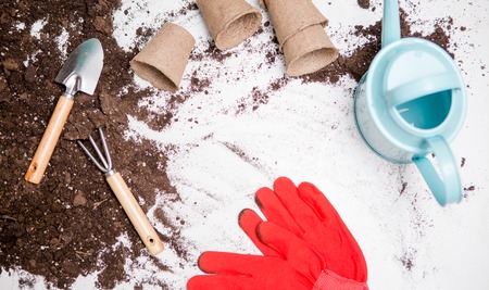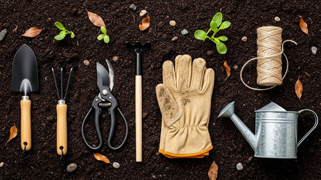 Overhead view of gardening tools, gloves, twine, and a watering can arranged on dark soil with sprouts.