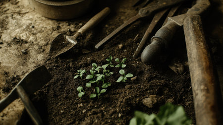 Discover the beauty of new life with fresh green seedlings emerging from rich soil, surrounded by rustic gardening tools for a perfect outdoor setting.