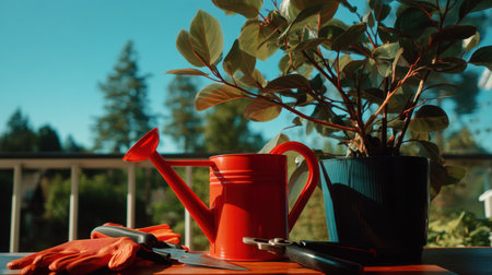 A vivid garden scene showing a red watering can, pruning shears, and gardening gloves on a table with a potted plant, bright sunlight, and an inviting atmosphere.