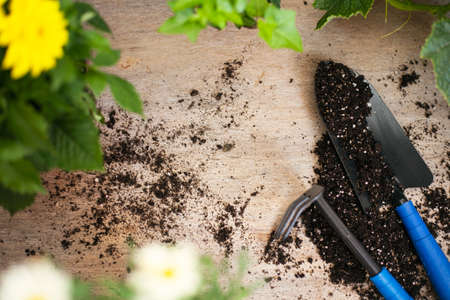 Planting flowers. Gardening tools and pots with soil on wooden background top view.