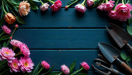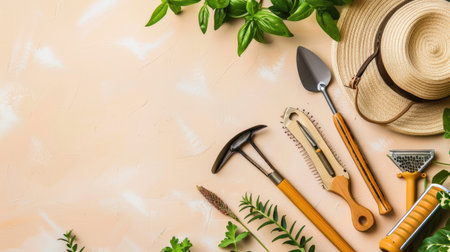 A flat lay of essential gardening tools displayed on rich soil with fresh plants, perfect for gardening enthusiasts seeking inspiration for their projects.