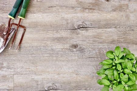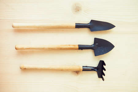 Gardener tool on wooden background. Gardener's tools: shovels and rake