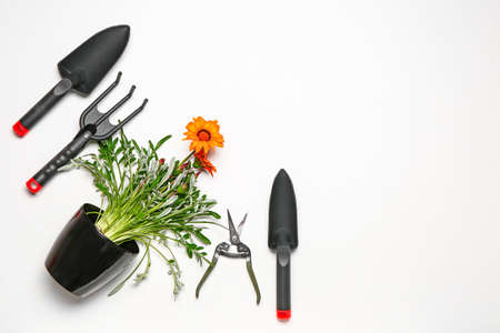 Gardening equipment and plant in hands. Hobbies activities layout for summer season