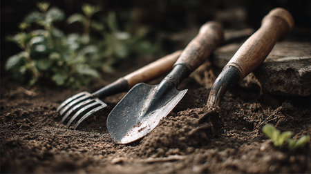A vibrant scene showcasing essential gardening tools including a spade, trowel, and gloves resting on rich, dark soil amidst green foliage, ready for planting.