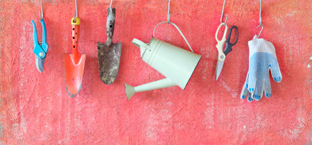 Gardening tools multiple instrument for your garden and flower with banner for your design.Top view space for agriculture tools hooby for stay at home.