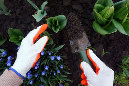 Hands in orange gloves plant blue flowers in the ground. Daffodils. Agriculture, gardening, agronomy. Green consumption concept. Conservation of nature, ecology. Caring, love for plants and flowers.