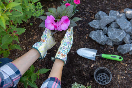 Female gardener planting flowers in her flowerbed. Gardening concept. Garden landscaping small business owner. Planting snapdragon seedlings. Top view.