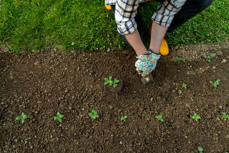 Woman planting young seedlings in the soil. Horticulture and sustainability gardening hobby. Healthy organic food concept