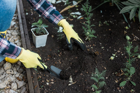 Gardener hand planting in backyard garden, Woman in gloves using hand shovel tool for seedling, Soil preparation for vegetable home garden.