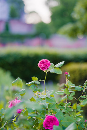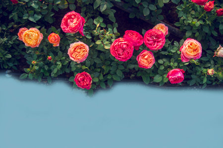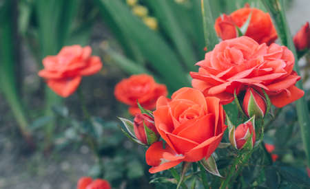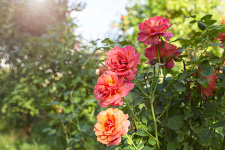 Beautiful blooming rose bush in the garden. Selective focus. Floral background for seasonal cards, blogs, posters and web design