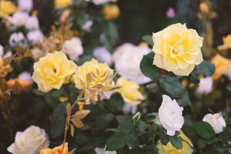 Yellow and white roses blooming in the garden for background or texture , Valentine's Day.