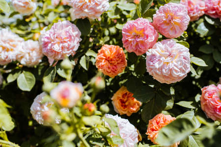 Bushes of beautiful fragrant pastel coloured pink and orange roses with green leaves.