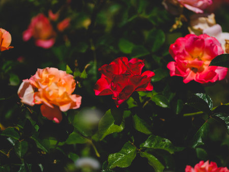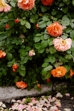 Orange blossoming amongst lush green foliage on a bush in summer garden. Beautiful rose blooms among lush leaves. A touch of floral elegance. Spring.