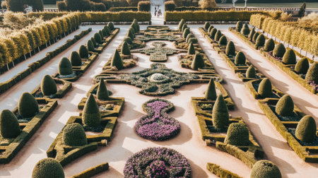 A stunning aerial view of a beautifully designed garden featuring intricate patterns, vibrant flowers, and well-maintained landscaping. Perfect for nature lovers.