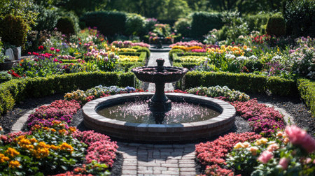 Beautifully manicured garden with colorful flowerbeds, trimmed hedges, and a small water fountain in the center.