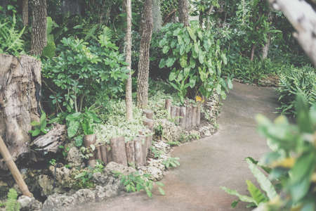 A pathway in spring garden in a shadow of green trees. Trimmed bushes and blooming flowers. Tropical landscape. Botanical park nature in daytime.
