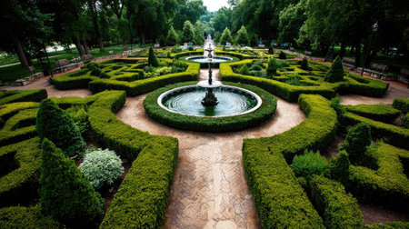 Symmetrical landscaped garden with trimmed hedges, stone path, and central fountain in a formal outdoor layout