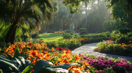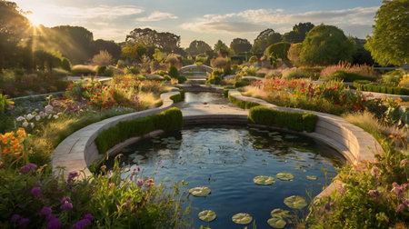 Vibrant garden filled with colorful flowers, lush greenery, and central fountain creates serene atmosphere. Benches are placed along pathways, inviting visitors to relax and enjoy nature beauty