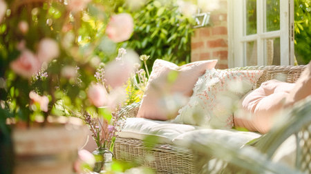 A patio adorned with wicker furniture and vibrant flowers in bloom under the sun.