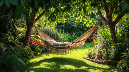 A serene garden scene featuring a cozy hammock suspended between two trees, with colorful flowers and lush greenery, inviting relaxation and tranquility.