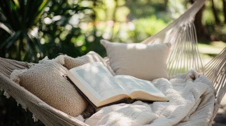A close-up of a hammock with soft cushions and a book resting on it, ideal for capturing a cozy, laid-back vibe