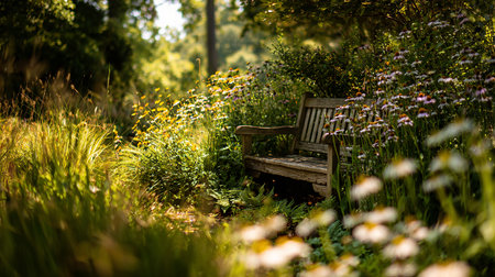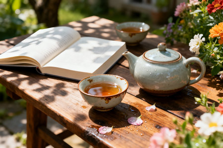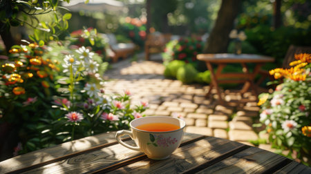 Serene garden scene with tea cup and books on bench amid wildflowers. That the image is generated using AI.