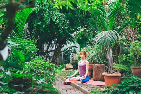 Portrait of gorgeous young woman practicing yoga indoor. Calmness and relax, female happiness.