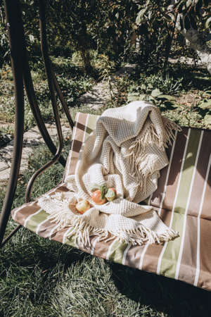 Ripe red apples with a leaves with white wool blanket on a garden swing. Three autumn apples on a swing in autumn garden.