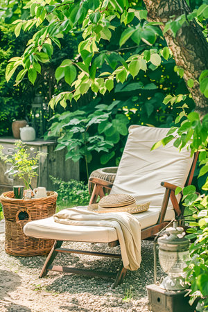 Chaise lounge in garden with wooden basket and tea table, retro style, cozy nook