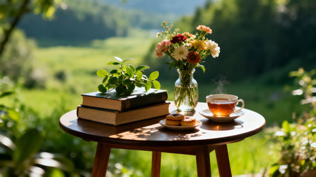 Cup of tea, books and flowers on a table in the garden