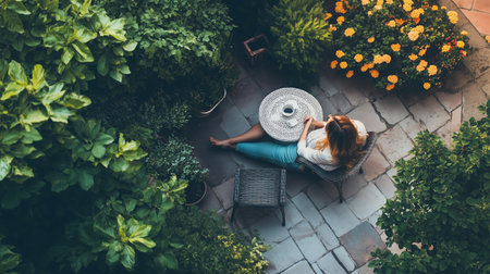Serene outdoor space with woman enjoying tea among lush greenery and blooming flowers in a peaceful garden setting