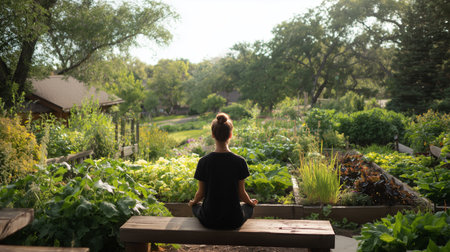 person, meditating in the midst of blooming garden, surrounded by flowers and greenery, created with generative ai