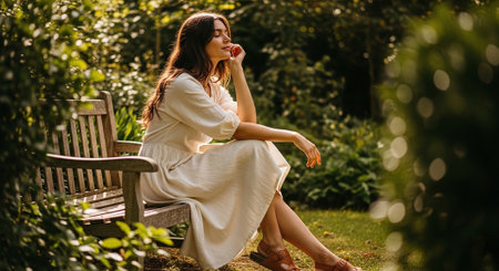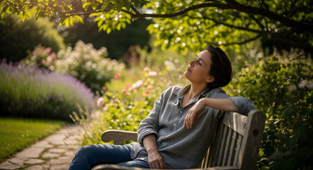 A woman sits relaxed on a wooden garden bench with her eyes closed, soaking in the warm sunlight and surrounding greenery. The image depicts finding peace, mindfulness, and enjoyment of nature.
