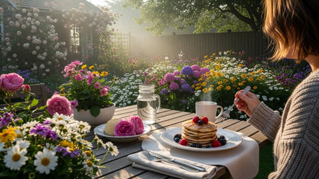 Woman having breakfast in the garden with pancakes and fresh berries on table