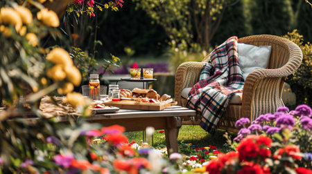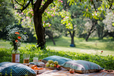 A picnic blanket is spread out on a vibrant green lawn surrounded by tall trees, shrubs, and colorful flowers, creating a picturesque tableau for a relaxing outdoor event AIG50
