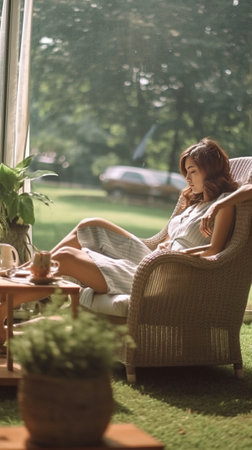 What a beautiful day Beautiful young woman relaxing in a big comfortable chair on her outdoor house terrace : Generative AI