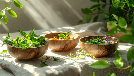 A tranquil outdoor scene featuring a rustic wooden table adorned with fresh herbs in pots and glass bottles, basking in soft sunlight surrounded by vibrant greenery.
