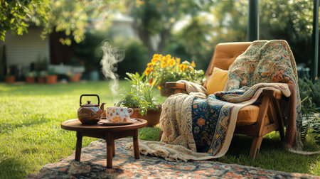 A serene outdoor space features a plush armchair draped with a soft blanket, beside a wooden table holding a teapot and cups, surrounded by lush greenery and potted flowers.