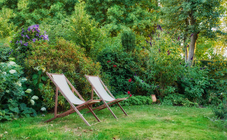 Many deck chairs and pillows with wooden table in the courtyard is surrounded by shady green grass. Comfortable pillows on outdoor patio chair and table in garden. Summer vacation. Selective focus.