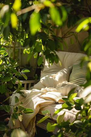 Morning light in garden, focus on a cozy reading nook, fresh and vibrant energy, close shot