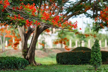 Big trees in the park. Trees of various sizes and types. Decorative plant in gardens.