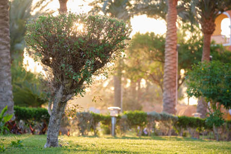 A young tree stands tall in a landscaped garden, bathed in the warm glow of the setting sun