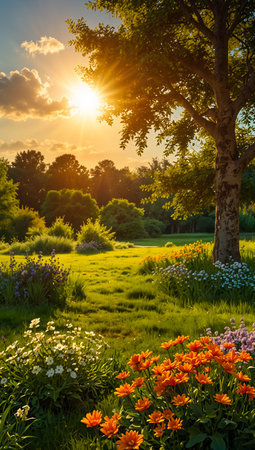 Sunlight filters through trees illuminating blossoming flowers in a vibrant garden at dusk